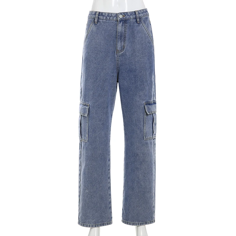 Very best Big Pockets Straight Baggy Denim Jeans Women High Waist Pant Casual Loose Cargo Pant Long Trouser F